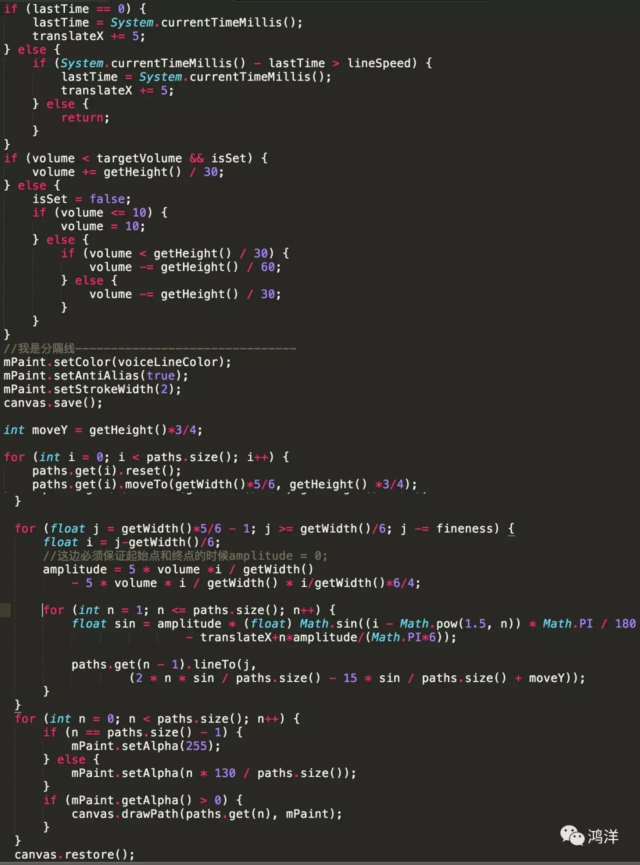 这边代码就不展开了,画的有点烦,简单说下,还需要自己体会哈。上面分隔线之前的说白了就是让声波动起来,也就是改变volume的值,然后后面有3个for循环。