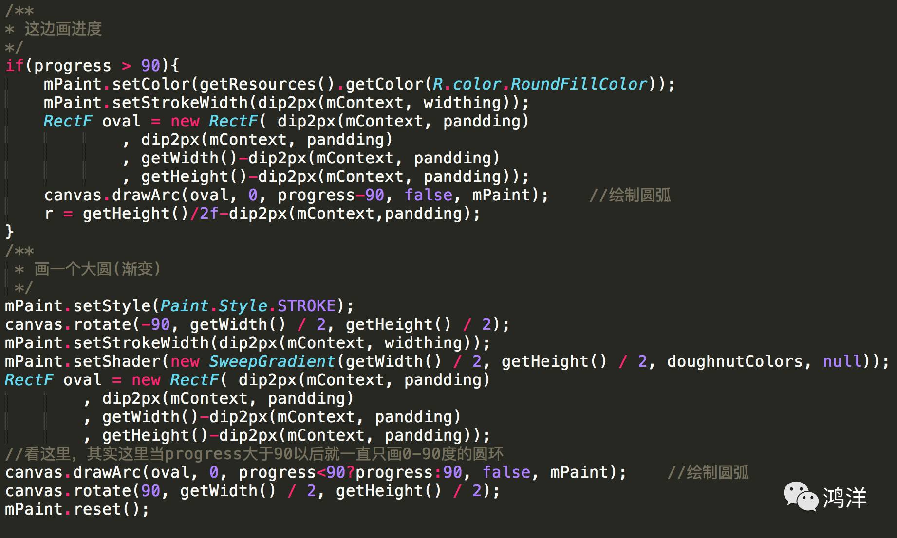 当progress<90的时候,我们画那个渐变的圆环,当>90的时候,我们同时画出那个渐变的和纯色的圆环(当progress的时候,这个时候其实那个渐变的圆环没变化,只是纯色的圆环一直在变)。