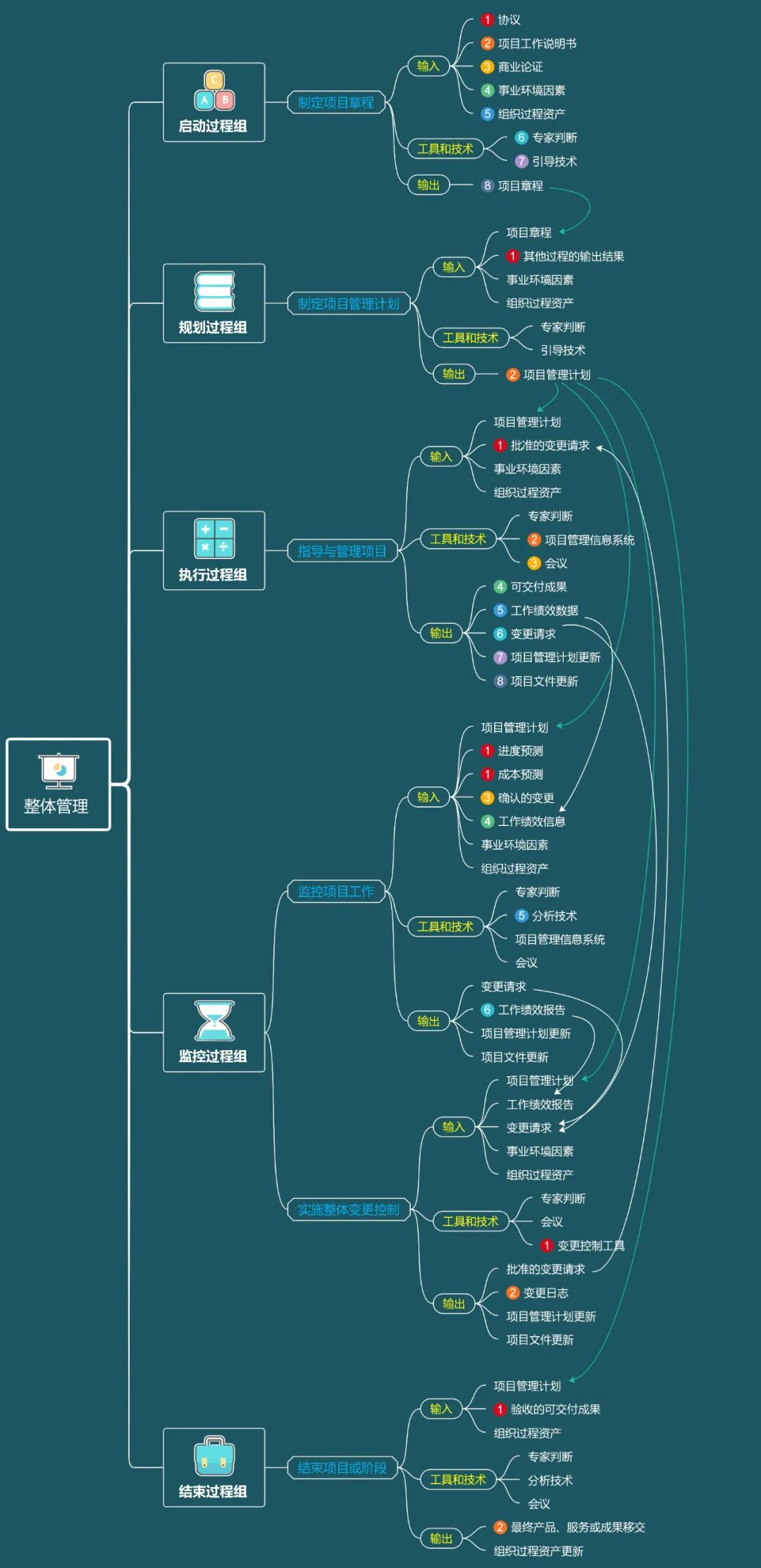 项目整体管理是项目管理十大知识领域的第一个领域。整体管理就是将范围、进度、成本、质量、人力资源、沟通、风险和采购等几个相互影响而又制约的方面有效形成整体,为项目的整体利益而工作,并努力在各个相互冲突的目标与方案之间权衡取舍。项目整体管理包括六个过程: