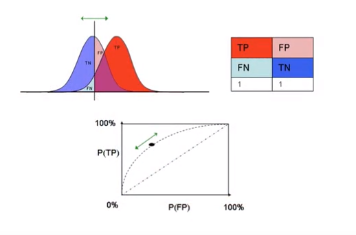 图中下半部分,横坐标为伪正类率(FP/P),纵坐标为真正类率(TP/P),当阈值取为1米时,几乎所有人都会被判断为男人,伪正类率和真正类率均为100%,对应的ROC点为最右上方点,而当阈值取3米时,所有人都会被判断为女人,伪正类率和真正类率均为0%,赌赢的ROC点为原点。一个二分类模型的阈值可能设定为高或低,每种阈值的设定会得出不同的 FPR 和 TPR ,将同一模型每个阈值的 (FPR, TPR) 坐标都画在 ROC 空间里,就成为特定模型的ROC曲线。ROC曲线横坐标为假正率(FPR),纵坐标为真正率(TPR)。