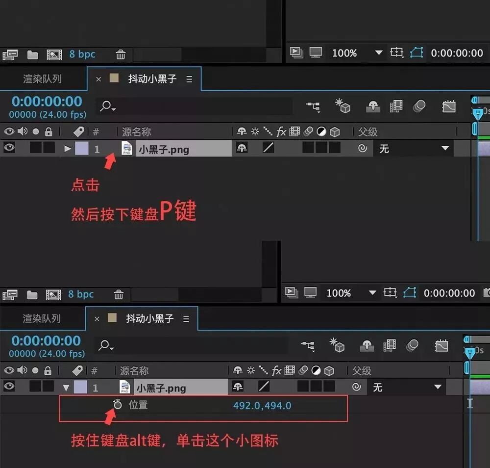 然后就是点击预合成的图层,按下键盘P键,会出现一些隐藏信息,然后按着键盘alt建,点击这个小图标,就会调出表达式的入口!!