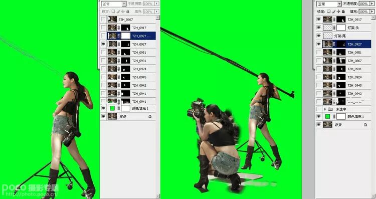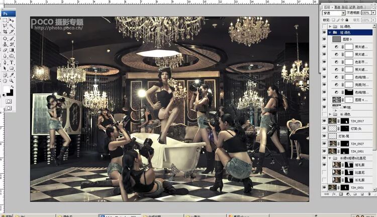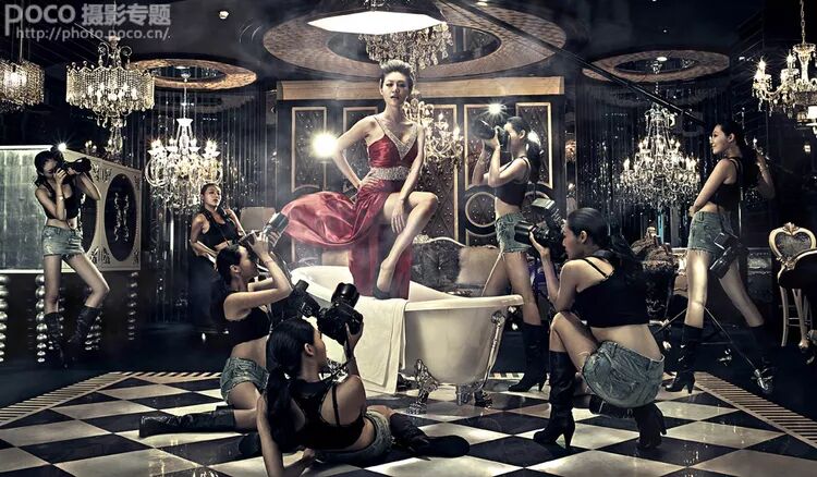 同一场景下同一人物重复出现的图片创意已经屡见不鲜,这次主要讲的是前后期高速高效完成这样的合成案例的流程。从图片是不难看到灯光的布置,顶灯,侧灯,反光,按部就班,根据气氛选择了现场光源及色温。模特不断的走位,营造出多人在场不同的动作编排,方便后期筛选工作。重点要说的是,也是理所当然的要用三脚架固定,配合引散,实现所谓的“定位”合成。