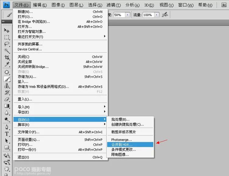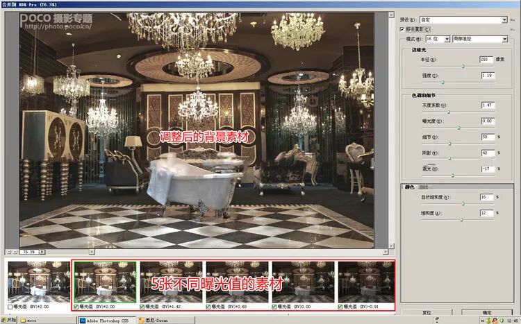在处理场景图的时候模拟多重曝光(+1, 0,-1档输出),利用PS自带插件处理HDR效果。