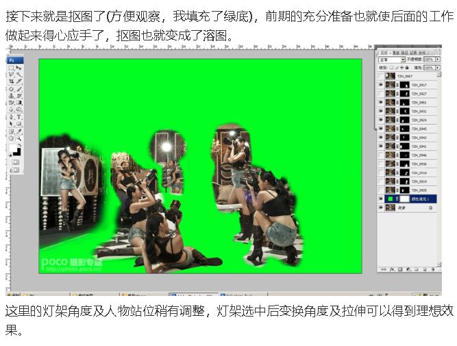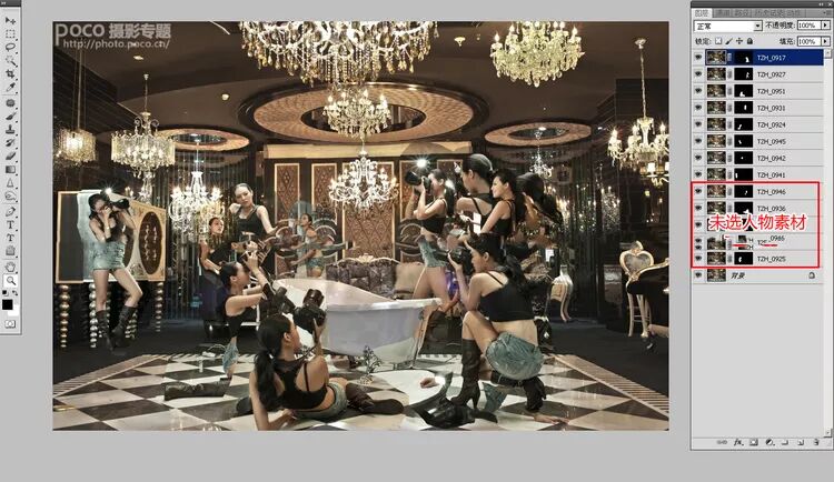 背景自动导入PS后,接着选取适当人物素材,根据合理的构图编排人物。经过一轮筛选后,大概固定了人物的位置和节奏。因为是同一场景拍摄的,所以只要稍微用蒙版擦拭一下,人物就可以融入场景中。