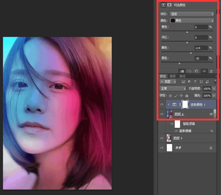 对色彩的明暗度和想要突出的颜色,进行调整:可选颜色