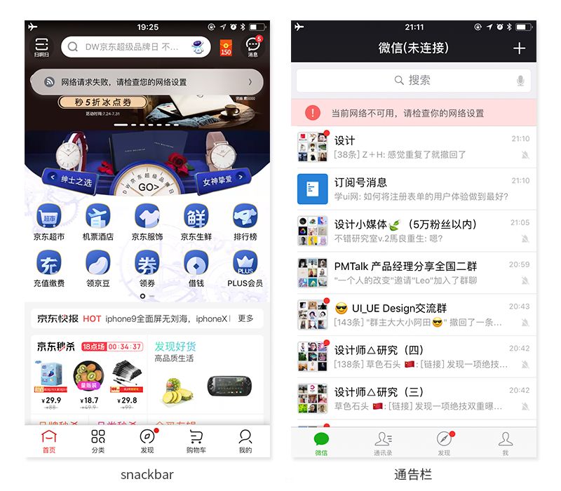 snackbar和通告栏的区别在于snackbar的位置是固定的,只要你的网络不畅通,那么它一直会出现在界面顶部。这是因为京东对于网络的诉求比微信要更强,没有网络微信用户还可以翻看聊天记录,京东用户没有网络还能干什么?没有办法浏览商品,更不用说剁手了,京东比微信更需要用户去解决网络故障的问题。