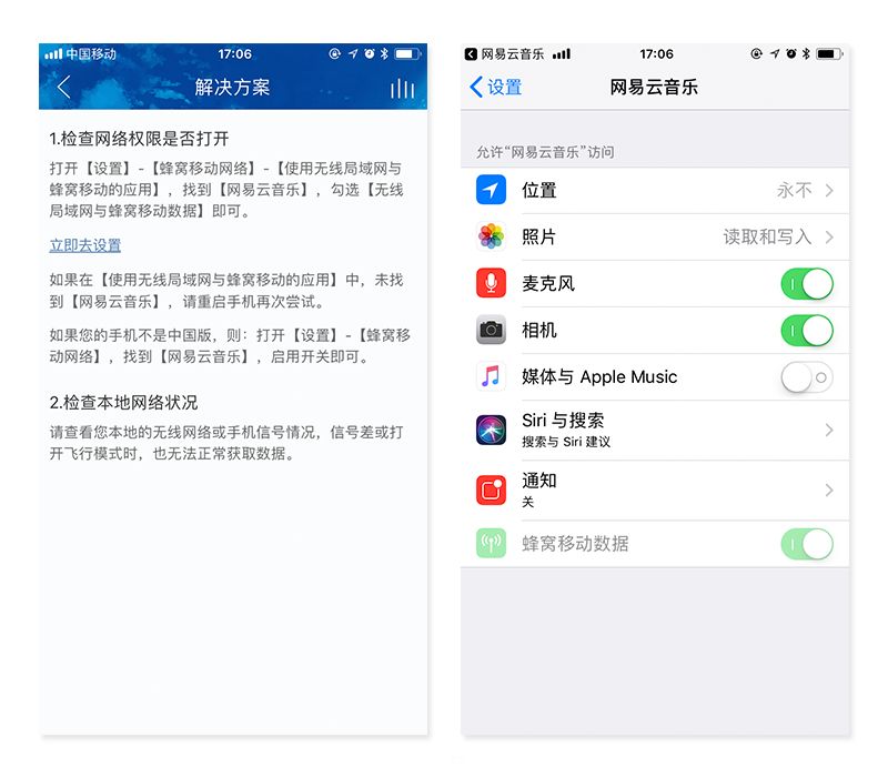 两种方案都有自己的道理,我个人更倾向于把两种方案进行融合。展示“刷新页面”的按钮,如果用户点击了还是没有办法请求到数据,这时以snackbar的形式提供解决方案。其实解决方案都是引导用户去系统设置里检查/开通网络权限。