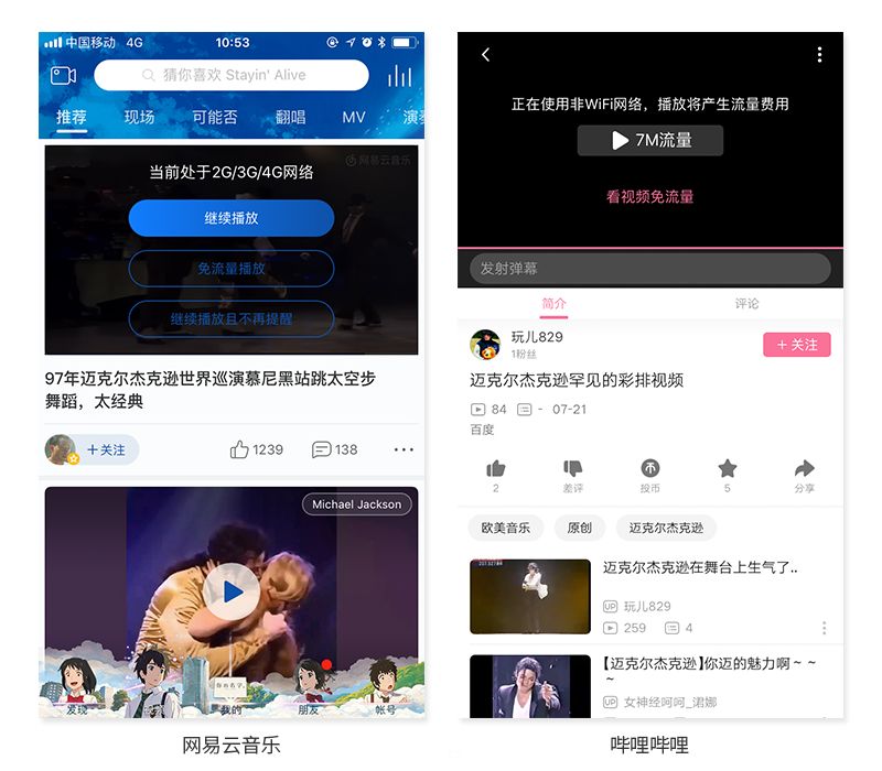 当我用wifi观看视频,突然wifi断掉,会自动切换至4G网络。为了避免让用户在不知情的情况下耗费大量的流量,我们应该给用户一个网络变更的提示,用户确认之后才可以继续观看。提示的方式目前来说主要界面内嵌和对话框,哔哩哔哩和网易云音乐这里用的都是界面内嵌。