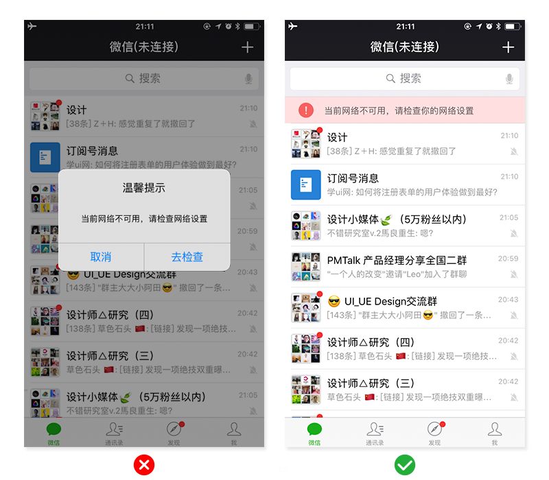 有缓存数据的页面,支付宝可以不提示用户,但是对于QQ和微信这类即时通讯类的应用来说,给予用户网络故障的反馈是非常有必要的。因为如果不给提示,我不知道对方突然不回我信息是我惹对方生气了还是我网络故障收不到。QQ和微信这里统一采用的是通告栏,用户点击之后进入一个展示网络故障解决方案的页面。这里可能会有人问,为什么不使用对话框,对话框也可以完成跳转动作啊。