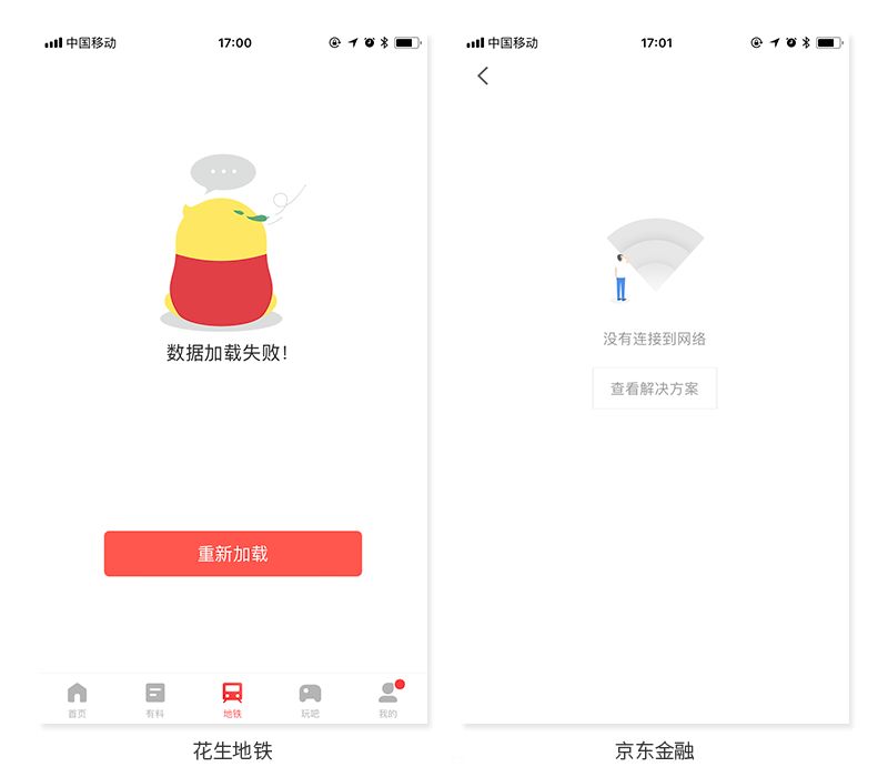 支付宝这种高冷也是有底气的,因为其多数页面都有缓存机制,用户不用每次进入这个页面都要去服务端请求一遍数据。类似的还有QQ音乐、咕咚,对于这些产品来说断网并不会带来灾难性的影响。因为断网不影响我去听缓存或下载好的歌曲,也不会影响记录运动数据。所以对于此类应用来说,当网络报错的时候,只要用户没有触发请求数据的操作,没有必要提示用户。
