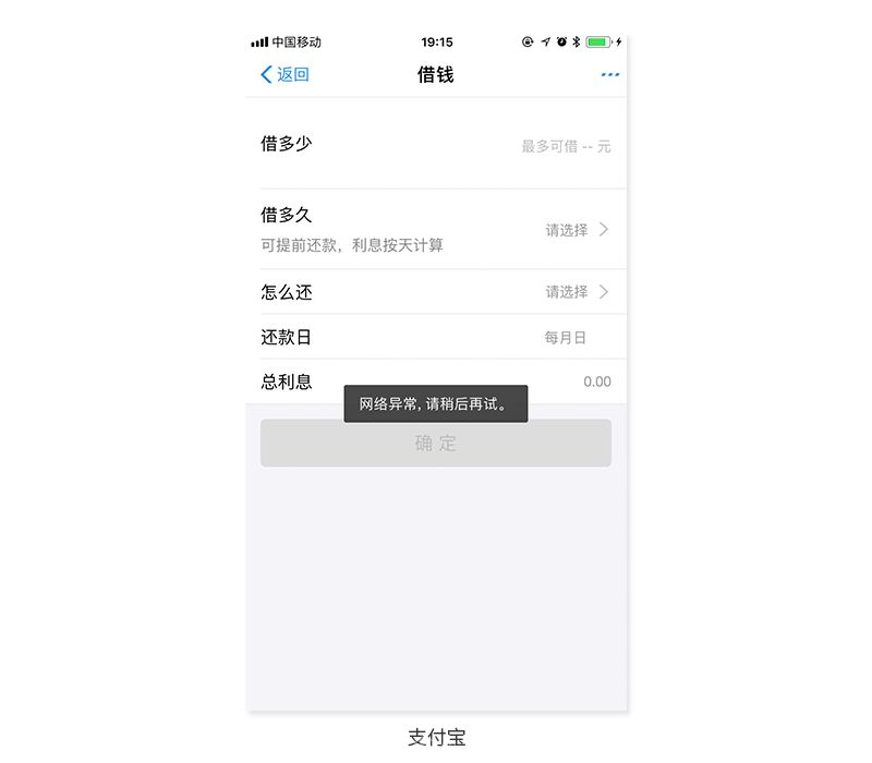 首先我们需要明确一个事实:不是每一种网络故障都需要提示用户。这里的“不提示”其实是一个相对的说法,并不是真的不给用户提示,而是只有用户执行了请求数据的操作才告知用户网络发生故障。支付宝就是一个典型的例子,即使断网了,用户基本也感知不到。只有用户请求了新数据,才会以toast通知用户网络异常。