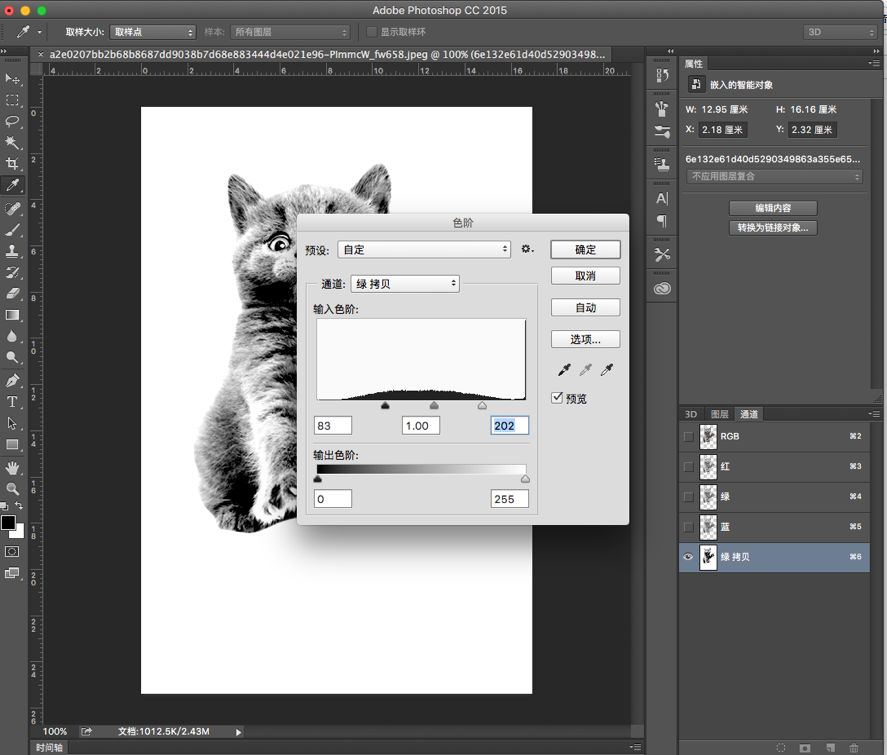 4、点击蓝副本,Ctrl+t调整色阶,得到一个反差效果最好的小猫。