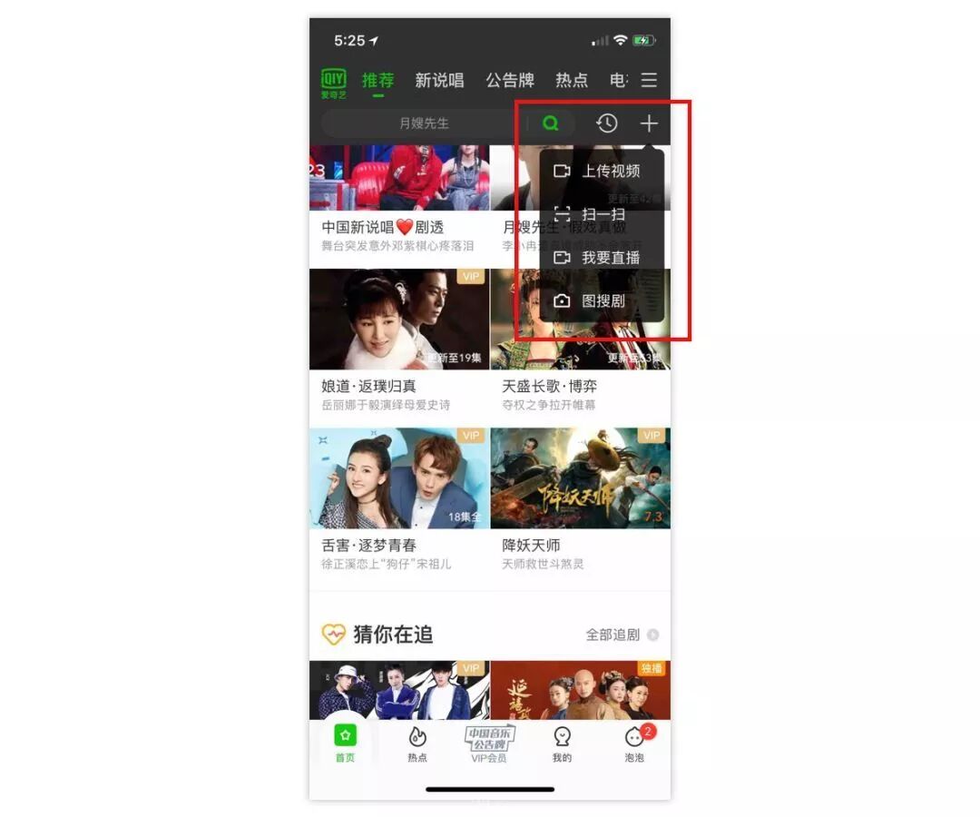 再比如:爱奇艺的“+”,里面包含的也是跟“添加”,“上传”相关,像上传视频、扫一扫、我要直播….