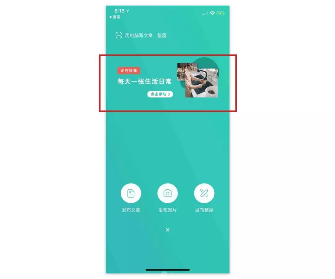 比如,“好好住”在发布环节,增加话题运营“#每天一张生活日常#”入口,就是解决刚才说的“用户不知道发什么”的问题。运营同学想点子、造话题、带节奏,从而提升用户的发布量。