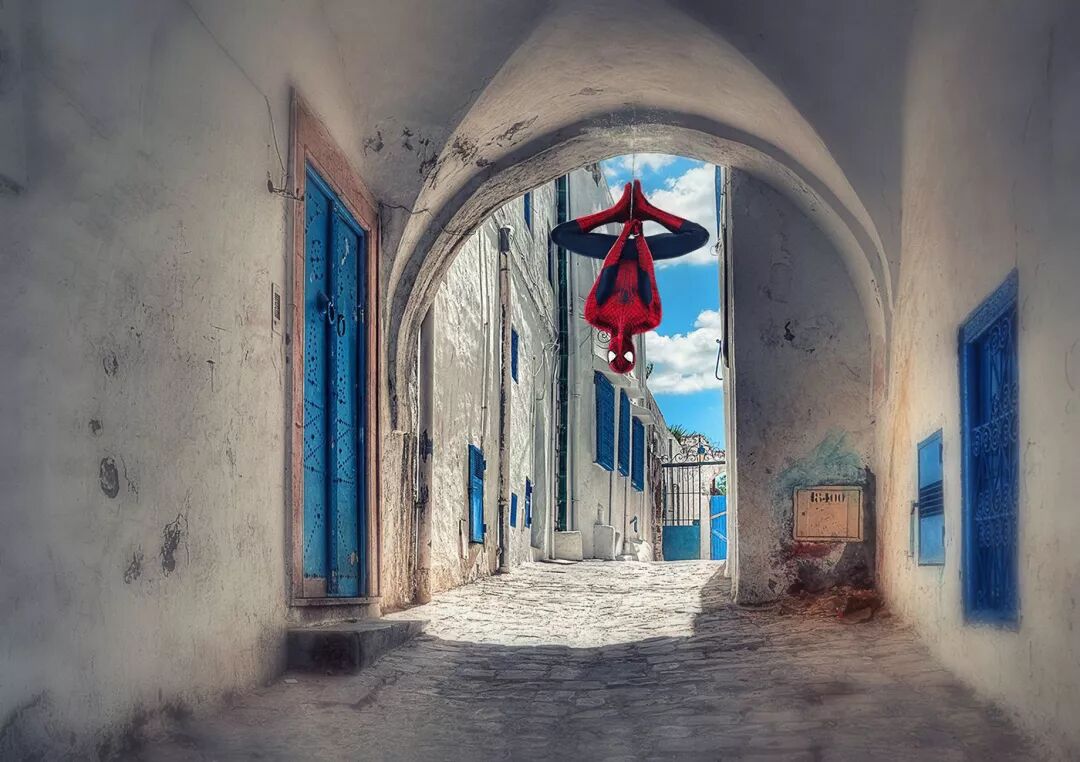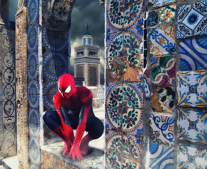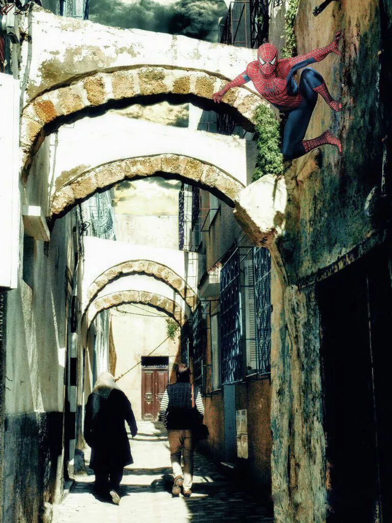 Ghali Amine 的《Spider-Man in tunisia》就是一组很有特点的作品,把蜘蛛侠放进突尼斯的街道场景中,本身就色彩鲜艳的街道与蜘蛛侠鲜艳的制服相映成辉。