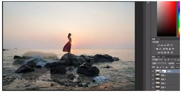 2、蒙版配合画笔,刷出海浪,把有人物的放在最顶,从上到下逐步刷出海浪,每刷一层海浪后,右键,向下合并一次图层。在这个过程中,会发现所有的光比需要进一步细微调节。如图所示,两者存在光比不一。