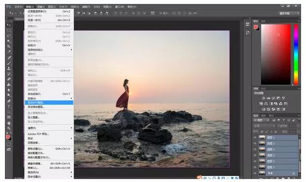 3、进行细节调整,光影调整,调色。这点就不展开描述了,每个人对颜色感受都不同。但是在光影调整上需要注意的是,此类风光人像,人虽然占得比例中等甚至说偏小,但是在光影上绝对不能太暗,否则无法吸引视觉。本图而言,我补齐了右边的海浪,因为在接下来做小星球效果时,两边的海浪正好能形成一个环。