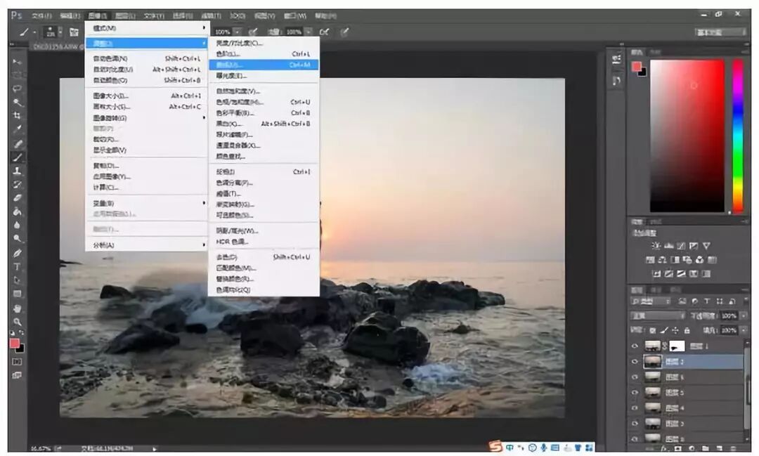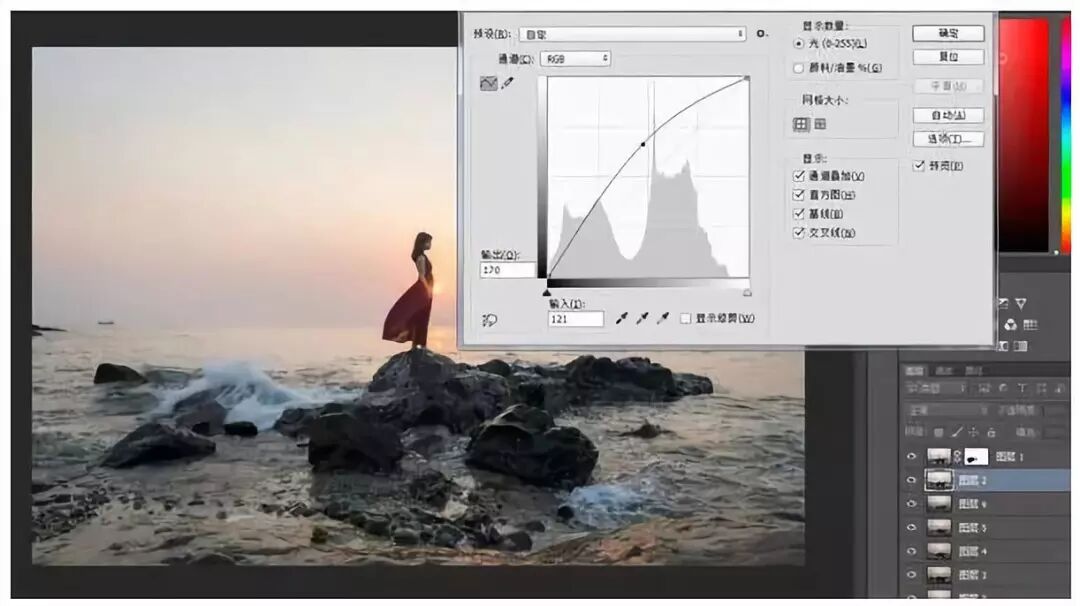 这时,只需要选定蒙版显示的图像(即海浪图),点击图像,调整,曲线(简单粗暴的可以用亮度),把两张图的光比调整到更为相似即可。