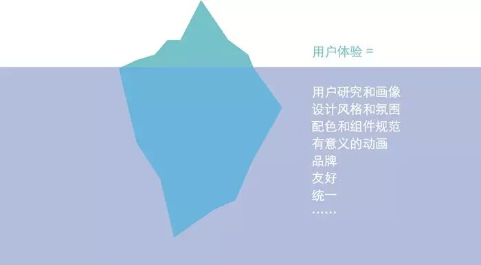 就 像冰山,露出水面的部分只占整个冰山的1/9,用户看到的只是显露出来的部分。背后的部分一般用户是看不到的:比如用户研究,用研团队会通过调查,输出一 些用户画像,影响整个产品的功能方向、设计风格;还有设计规范,设计团队在设计产品的一开始制定了规范之后,新增加的功能和页面都必须遵循已有的设计规 范,这样整个产品是统一的,能够给用户专业的感觉。