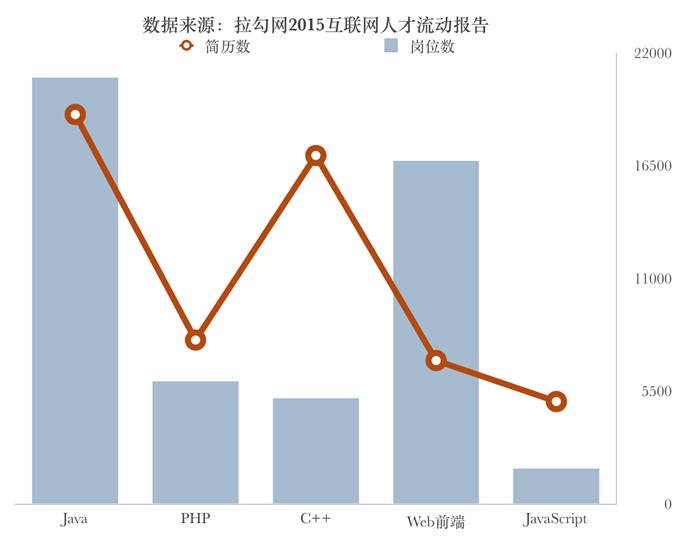 根据中国招聘平台拉勾网“2015年互联网人才流动报告”,前端相关岗位的简历投递数只有岗位数的一半。与此同时,服务器开发方向(比如Java、PHP、C++等)的简历投递数都大大高于岗位数。从图表可以看出,前端开发仍然处于人才紧缺阶段。