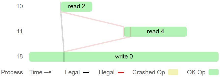 图中显示了三个进程(10,11,18)并发执行读取到2,读取到4和写入0的操作记录。从左到右为时间线,操作方框的左侧表示操作的开始时间,右侧表示结束时间,操作实际生效的时间可能在开始时间和结束时间之间的任意时刻。进程10读取到的值为2,该读取可以在进程18写入0的之前或之后,在进程11执行读取的时间段内,数据的值可能为0或者2,但不管数据的值为0还是2,都不允许进程11读取到4,因此不满足可线性化。