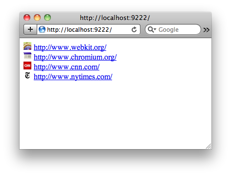 3. Navigate to the given port from your client browser instance (WebKit nightly will do) and it will list inspectable pages opened in the browser as web links.