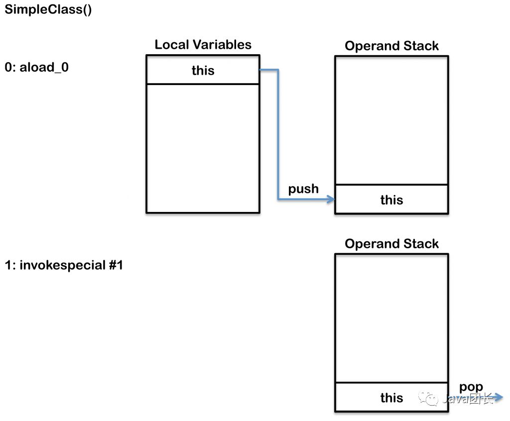 构造器函数包含两个指令。首先,this 变量被压栈到操作数栈,然后父类的构造器函数被调用,而这个构造器会消费 this,之后 this 被弹出操作数栈。