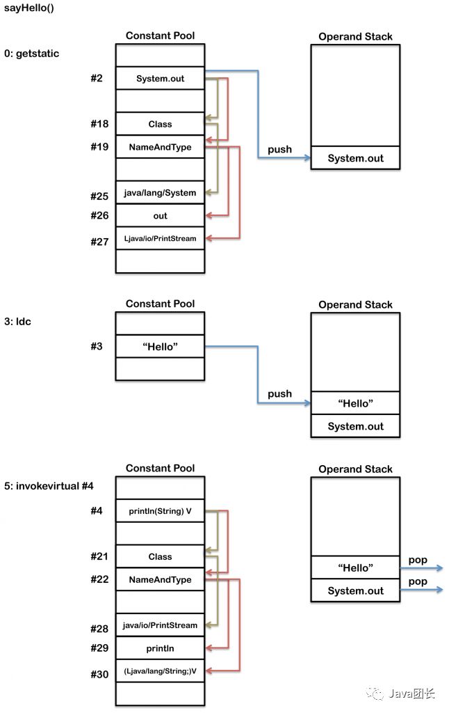 sayHello() 方法更加复杂,正如之前解释的那样,因为它需要用运行时常量池中的指向符号引用的真实引用。第一个操作码 getstatic 从System类中将out静态变量压到操作数栈。下一个操作码 ldc 把字符串 “Hello” 压栈到操作数栈。最后 invokevirtual 操作符会调用 System.out 变量的 println 方法,从操作数栈作弹出”Hello” 变量作为 println 的一个参数,并在当前线程开辟一个新栈帧。