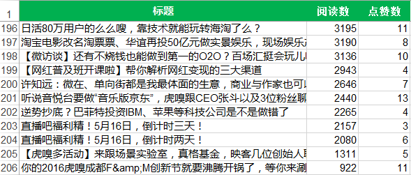 我是这么操作的,首先统计一下虎嗅网过去1个月的206篇文章标题、阅读数和点赞数,然后看阅读数最高的前20篇文章,而阅读数最低的10篇文章,并分析和研究,造成这样差异的原因在哪里。