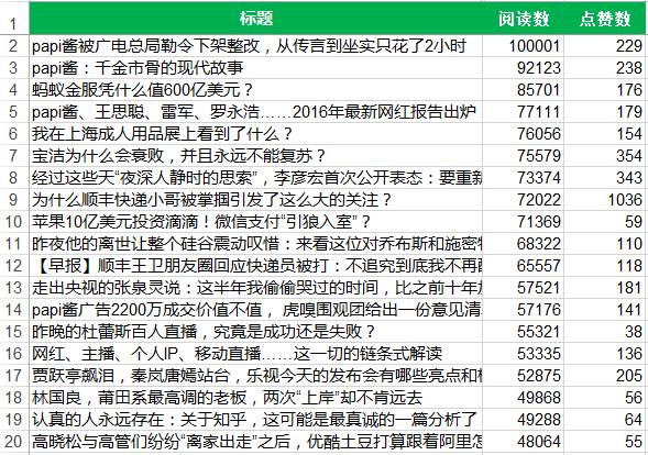 1. Papi酱、成人用品展、杜蕾斯空气炮、百度莆田系、直播等热门话题的报道和剖析本身就容易带来更高的关注和流量。给我的启发是,如果有机会结合热点写一些深度文章会有不小的传播。