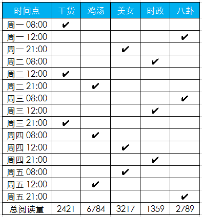 下面这个图就是根据上面的计划要求排的一个内容投放时间表,根据表排的时间发内容,并进行阅读量的统计,这样根据实际反馈得到的结论就会更靠谱一些。