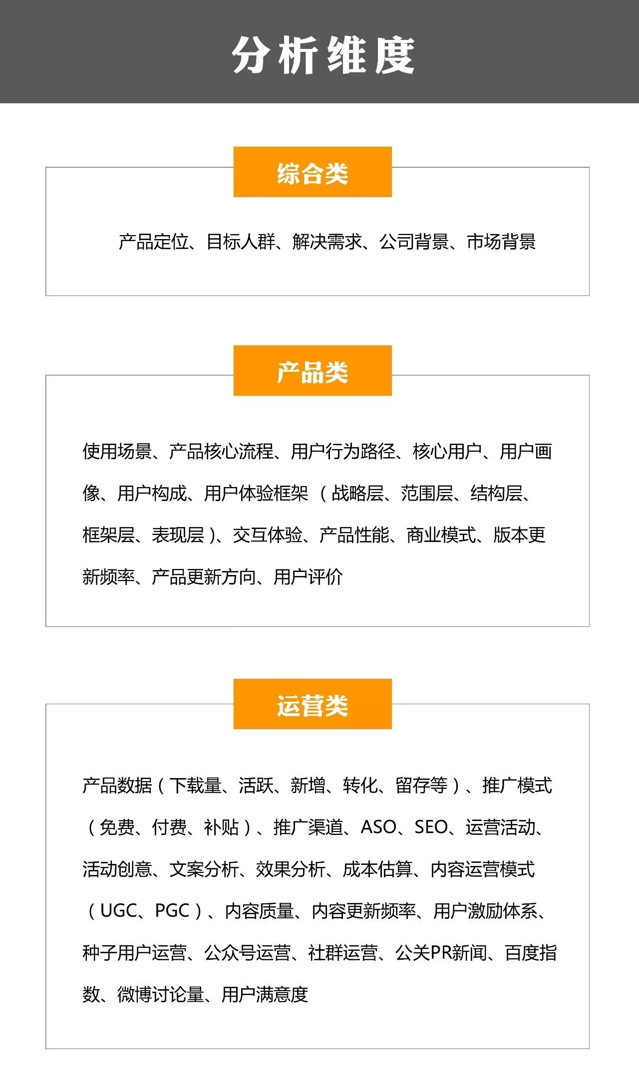 实际分析中,结合竞品分析的目的,选取几个(不是全部!!!)作为分析的维度。