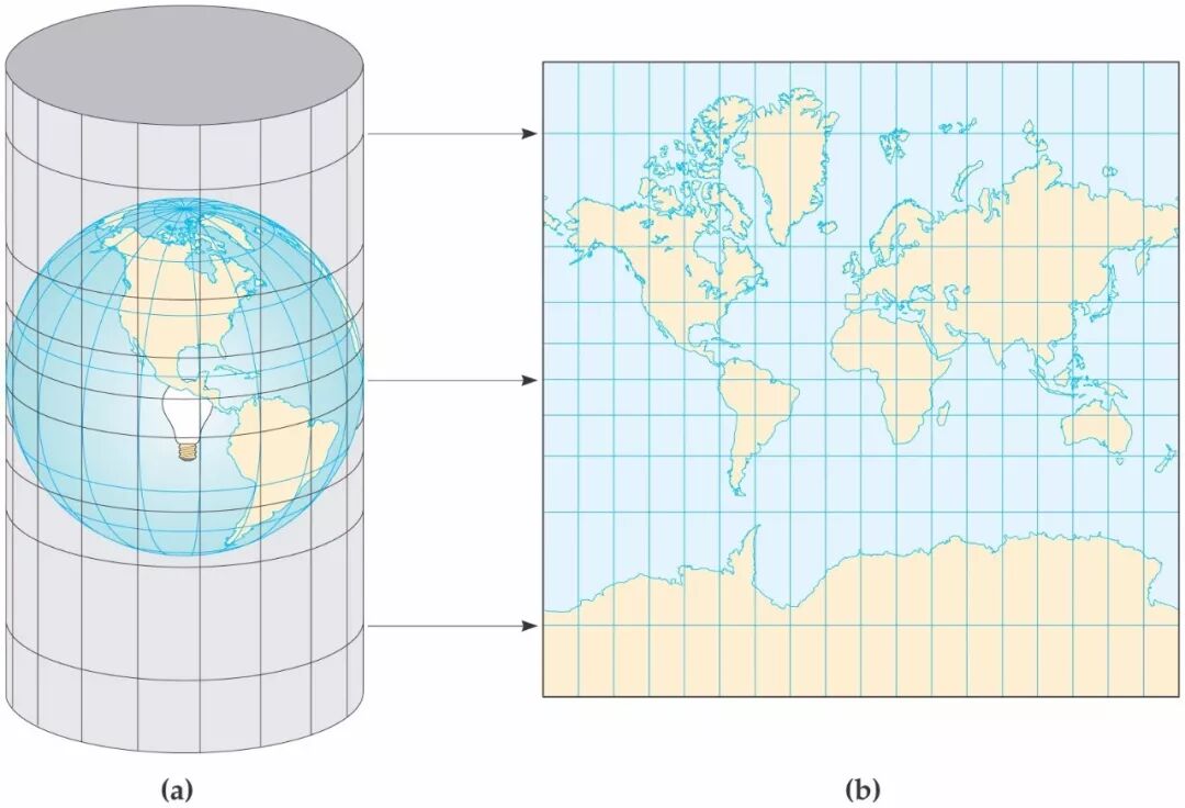 但是地球是一种不可能展开的曲面,要把这样一个曲面投影到平面上,就会发生裂隙或褶皱。如果是把投影的平面改为曲面呢?比如圆锥、圆柱、从而产生了各种投影方法。