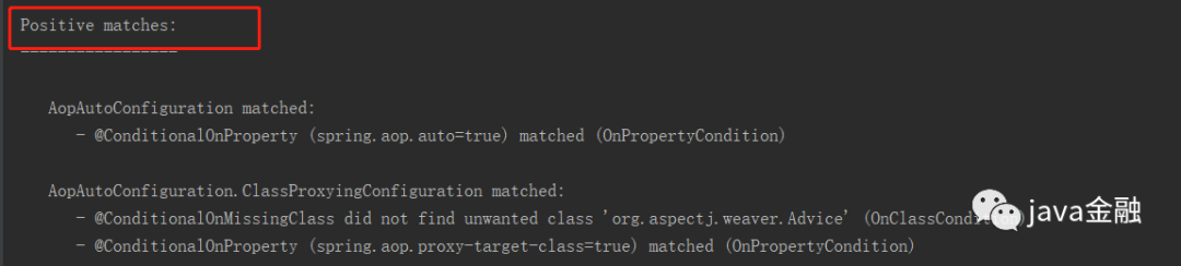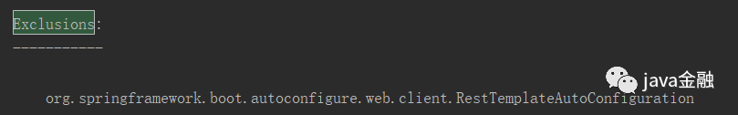Positive matches:@Conditional条件为真,配置类被Spring容器加载。Negative matches:@Conditional条件为假,配置类未被Spring容器加载。Exclusions:我们明确了不需要加载的类。比如在上面启动类配置的RestTemplateAutoConfiguration类Unconditional classes:自动配置类不包含任何类级别的条件,也就是说,类始终会被自动加载。