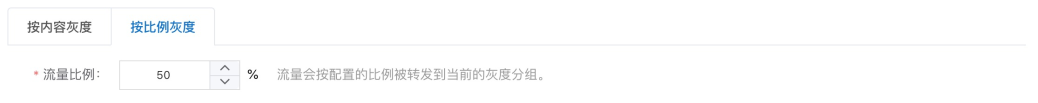 按比例灰度即设置流量比例,然后请求流量会按配置的比例被转发到当前的灰度分组中进行处理。