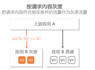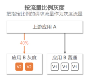 目前支持按内容灰度和按比例灰度两种方式设置灰度规则。按请求内容进行灰度支持将请求内容符合指定灰度规则条件的流量作为灰度流量,进入到灰度实例中,例如,选择用户 ID 模 100 小于等于 40 的流量作为灰度流量进入灰度实例进行处理,而用户 ID 模 100 大于 40 的仍然进入非灰度实例进行处理,如图 1 所示。而按流量比例进行灰度是指,将指定比例的请求流量作为灰度流量进入灰度实例进行处理,例如指定 40% 的流量作为灰度流量,如图 2 所示。