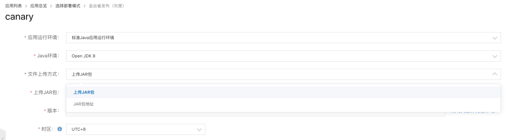 在发布页面,可以选择通过上传 JAR 包或者填入 JAR 包地址的方式选择要进行发布的新版本应用部署包。