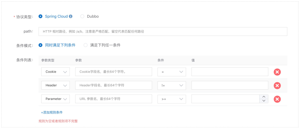 条件列表:Spring Cloud 协议下可分别对 Cookie、Header 和 Parameter 3 种请求内容进行条件配置。