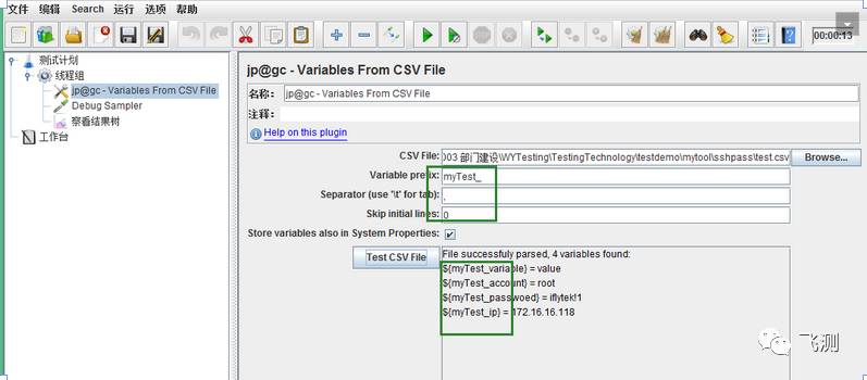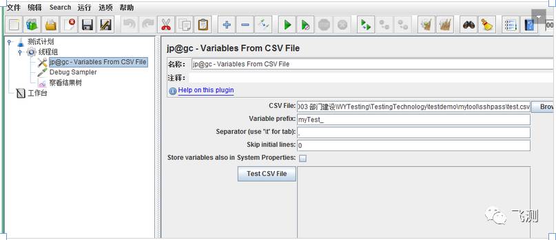 1、csv的配置如图,队列是变量名称,第二列是变量的值,第一行是标题行
