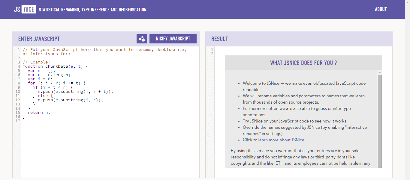 JS Nice 是一个用于JavaScript的反代码混淆以及反极简主义的高级代理程序。它可以增加模糊的JavaScript代码的可读性并删除掉代码中的无用字符。由于其包含了开源项目中的许多先进的机器学习技术,它还能够为JavaScript项目快速提供标识符名称和类型的建议。