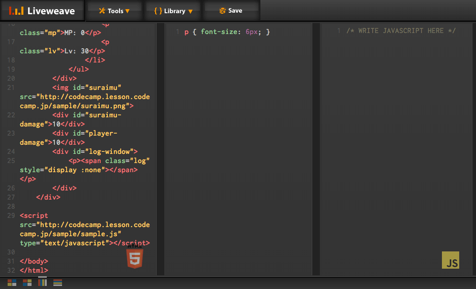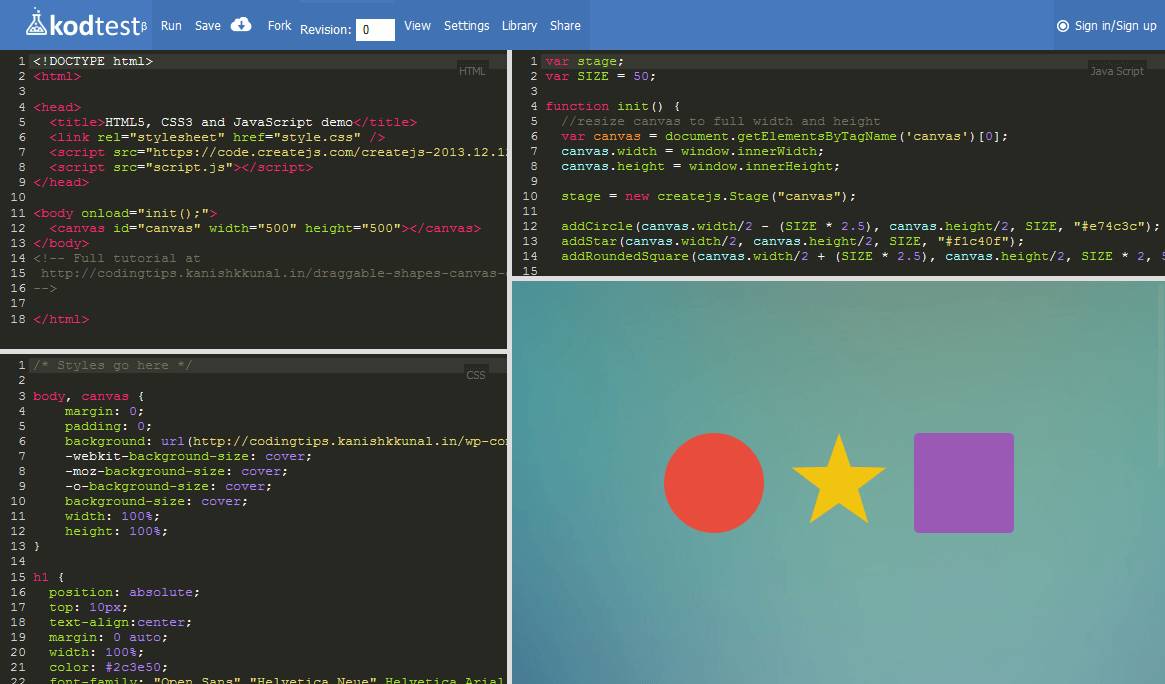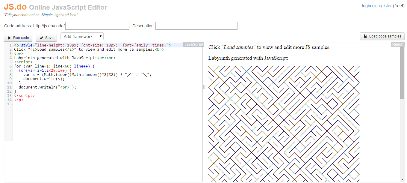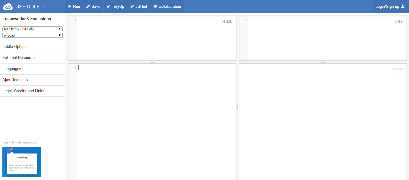 JS bin是一个为JavaScript和CSS爱好者们提供特定情况下的代码片段测试的网站。它可以让你和你的同伴合作调试代码。你可以在这里编辑和测试JavaScript和HTML代码,一旦你觉得满意,可以把相关的网址发送给你的同伴,以获取他们的看法和帮助。