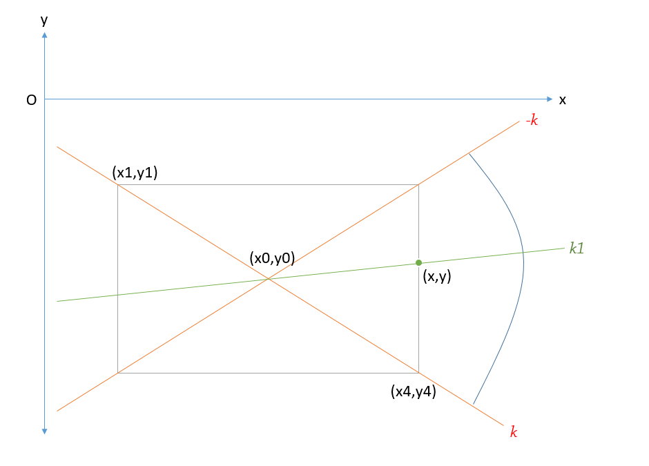同时由于(x1,y1)与(x4,y4)这条对角线在坐标系中一定经过的是第二和第四象限,所以k肯定是负值,而 -k一定是正值。