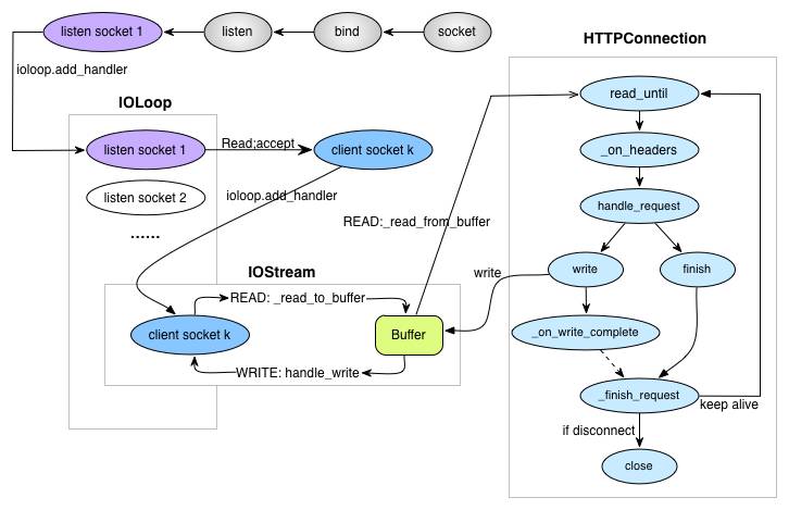IOLoop在监听端口,当对应的fd ready时会回调注册的handler去处理请求,这里的handler就是我们写业务逻辑的RequestHandler