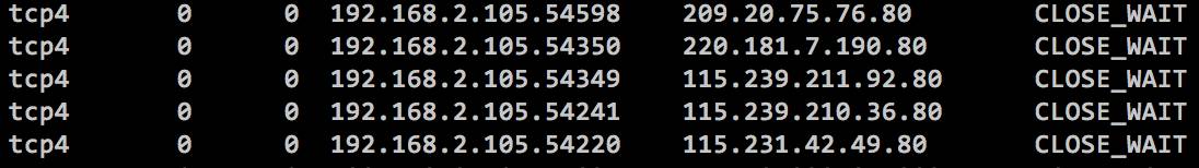 我擦,close_wait又让我撞见了. 看了几台应用服务器都是上百个close_wait. (加起来有近千个close_wait, 发财了)。