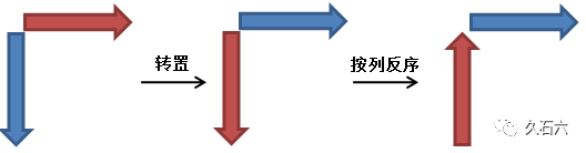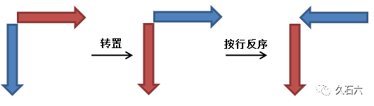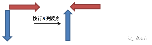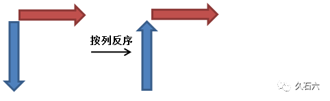 有些人可能看不太明白,我们可以简化一点,看看其中的逻辑。如下图所示,棕红色条状代表辅助行,蓝色条状代表辅助列,箭头代表数据的顺序,那么以上转换过程就可以简化成: