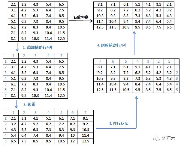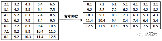 工作中遇到个问题,需要将Excel中的数据块或者说二维数组向右旋转90度,才能再加工处理。当然,不是旋转文本方向,那太容易了,而是整体旋转改变数据块的排列组合顺序。如下所示: