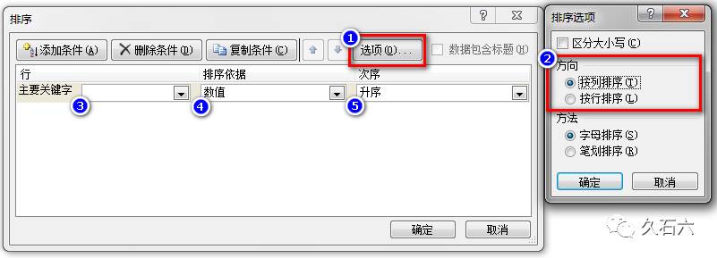 Excel 菜单“开始” => 排序和筛选 => 自定义排序 => 蹦出下图左边的对话框=>点击“选项”按钮蹦出右边的对话框,看到没?默认的“按列排序”,选择“按行排序”就好了,然后依次选择“主要关键字”、排序依据、次序,好啦,大功告成!