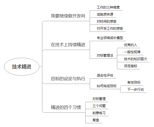 本文就从这两方面来展开,先讲如何确认自己是否要继续做开发,这部分会提供一些方法(比如工作的三种分类、时间感觉、成就感来源、工作感受等),让大家能够自我觉知和判断;然后我们会沿着开发这条线继续前进,看看如何在技术上持续精进,这部分最重要的是对标管理法及其四种典型标杆;再接下来,我们会讲怎样设定有效目标,找到下一步行动,把精进落地;最后,我们会介绍四个习惯,让精进成为你自身的一部分。