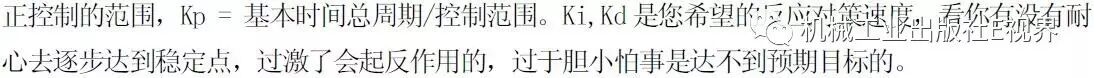 控制的方法不是只有PID一种,在很多场合他也未必就是最佳的控制算法,随着大量的应用研究,有很多种新的理念新的方法可以完全替代它,但是PID作为一种基本的控制算法已经比较成熟,基于PID为基础的变种算法或者叫做加强算法也派生了很多,他们的控制效果往往会比PID更有效,最常见的是这里的3个参数以控制目标为基准,参数相应成比例的变化,PID上的PID。面向每一个的工作对象,您可以摸索出一种最适合您的对象的控制方法,不拘一格,开创自己的路。