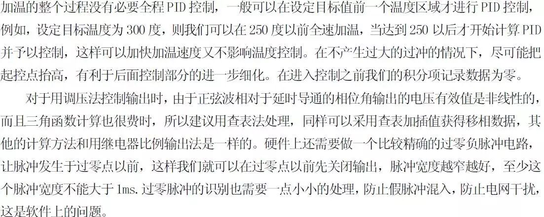 在通用仪表行业用的比较多,因为他们的工作对象是不确定的,而不同的对象所使用的参数是千变万化的,所以无法为用户设定参数。这就引入了自整定的概念,用户首次使用的时候,启动自整定功能专门为新的工作对象寻找一套参数,并把他们记忆下来,作为今后工作的依据。其实自整定也就是作N次的测定,根据实际变化反应反复对参数进行修正,当达到一定要求后宣告自整定完成。这是一个多元素的优化问题,可以采用很多种优化方法,例如0.618黄金分割法就是一种很不错的算法,可以参考有关优化算法的书籍,我们这里就不做讨论了,需要说明的是,我们是对全部参数进行同时优化的,根据出现的不同情况去修正不同参数,我们的修正量将逐步缩小,当我们的修正量达到一定的范围以后,或者实测温度变化波动已经达到一定范围以后就可以认为自整定过程结束,记录最后结果返回正常控制状态。由于优化过程需要进行大量的试探,所以一次自整定过程往往需要花费很长时间,一般在半小时到两个小时左右。